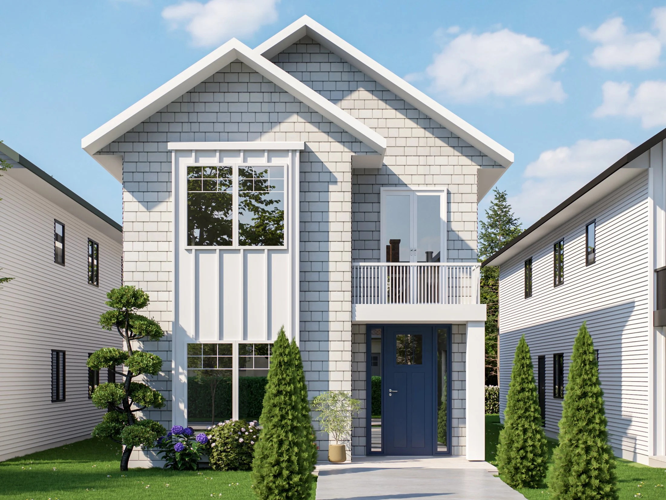 FACADE | AS PER RENDER, LIGHT GREY FIBER-CEMENT HARDI-SHINGLES, WHITE BOARD + BATTON AND LAP-SIDING ON EXTERIOR FINISHES. ACCENTS OF NAVY BLUE FOR EXTERIOR DOOR AND WHITE FOR FASCIA AND TRIM IN FIBER-CEMENT MATERIAL.